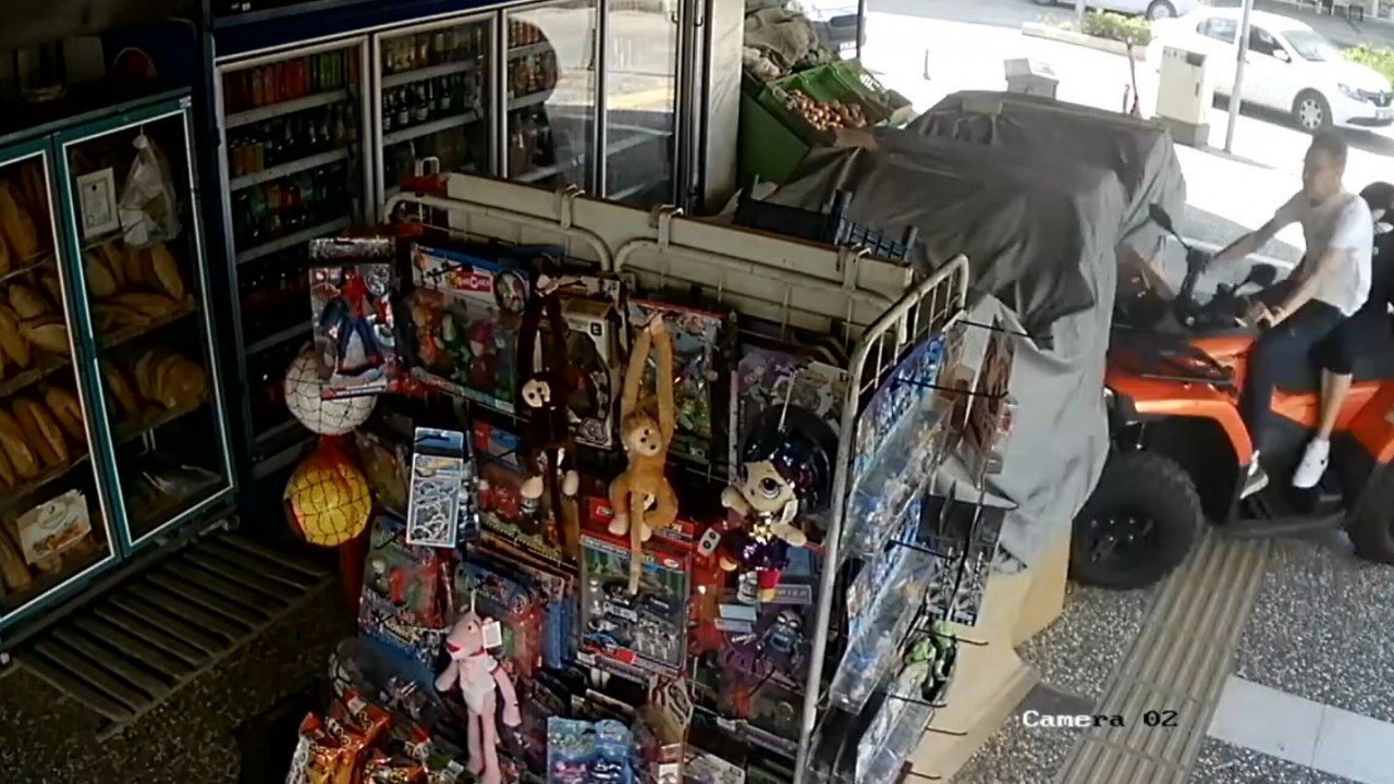 Saniye saniye güvenlik kamerasına yansıyan kazada, ATV’nin su kolileri sayesinde dolaplara ve cam vitrine çarpmaktan kurtulduğu, çevredeki vatandaşların yardıma koştuğu, market sahibi kadının doğrudan dolaptan su alıp, yüzünde kan olan Alman turiste su verdiği görüldü.